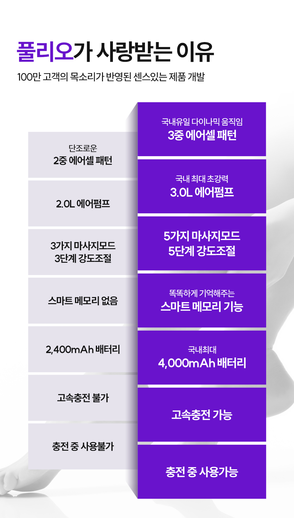 “2개의 손과 3개의 손, 무엇이 더 시원할까요?” 풀리오는 묻습니다. 당연히 3개의 손이죠! 기존 종아리 마사지기들은 단조로운 2중 에어셀 구조로, 종아리 근육의 크기와 형태를 제대로 고려하지 못했습니다. 하지만 풀리오 V3는 다릅니다.
