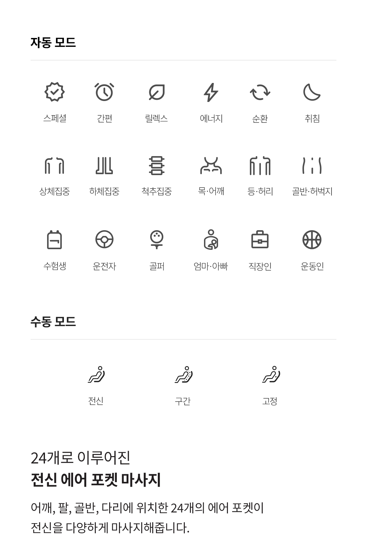 - 집중 모드: 특정 부위를 집중적으로 마사지하여 피로를 해소하고 싶을 때 유용합니다. 목/어깨, 허리, 골반 등 원하는 부위를 선택하여 마사지할 수 있습니다.