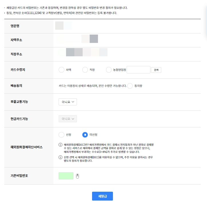 - 재발급 비용이 발생할 수 있으며, 카드 종류에 따라 상이합니다.