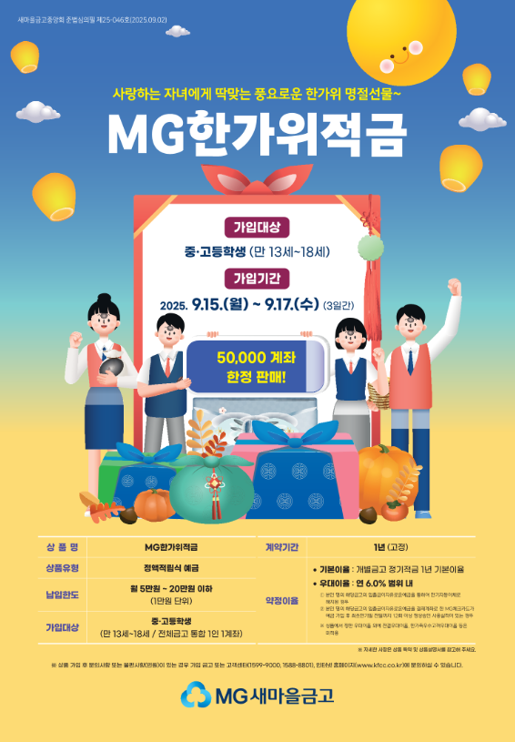 짧은 판매기간에 ‘6%대 우대금리’를 내건 MG한가위적금이 등장했습니다. 13~18세 청소년 전용, 월 5만~20만원까지 1년간 꾸준히 모으면 금고별 기본이율에 최대 연 6% 우대이율이 붙는 구조라 실속이 큽니다. 전국 5만좌 한정이라 속도가 관건! 아래에서 판매 일정, 가입 조건, 준비물, 예상 수익, 리스크 관리까지 한 번에 정리해 드립니다. (판매 9/15~9/17, 3일 한정).